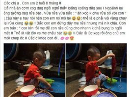 Thấy bố mẹ ăn xong không dọn, bé trai vừa rửa bát vừa nói câu khiến cả nhà “đứng hình”
