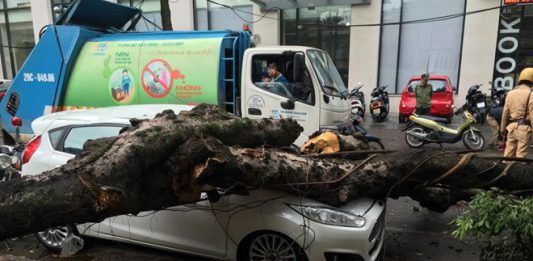 Cây cổ thụ bật gốc đè ôtô trên phố