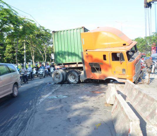 TP.HCM: Xe container mất lái, húc văng hàng loạt dải phân cách