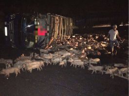 Lật xe tải chở lợn, hàng trăm con lợn bị văng ra ngoài chết khiến lái xe thất thần