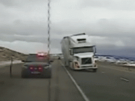 Bị ảnh hưởng của gió lớn, container nghiêng ngả rồi đè bẹp xe cảnh sát đang đỗ bên lề đường