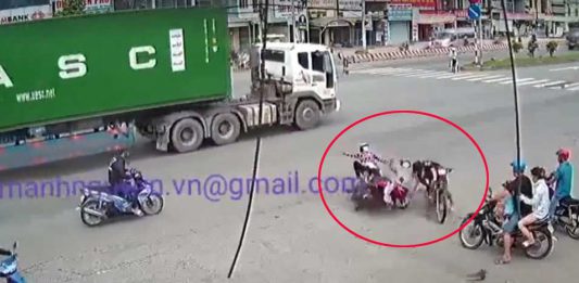 Chạy xe máy cắt mặt container, thanh niên tông bay 2 người